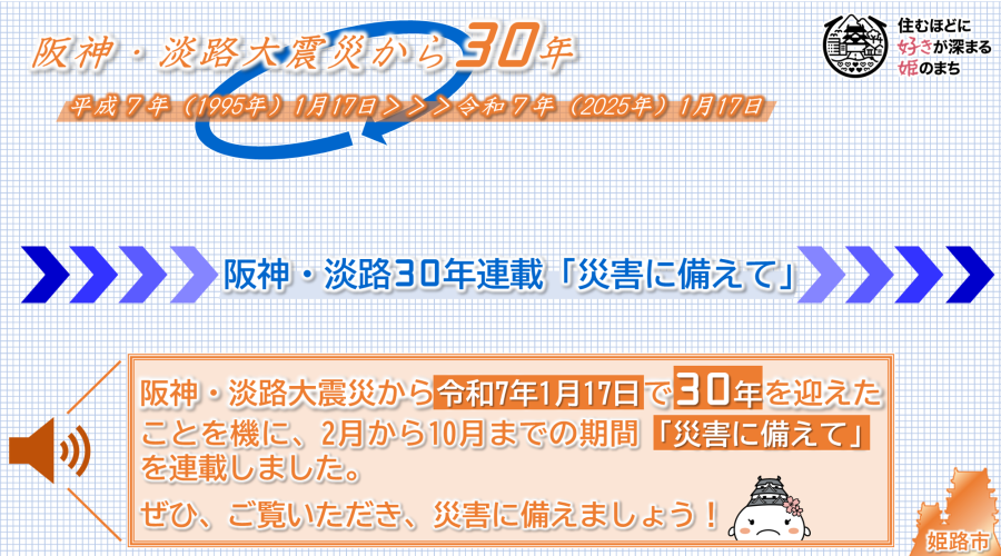 本ページでは、阪神・淡路大震災から30年を機に、令和7年2月から10月の間に「災害に備えて」と題して連載しましたので、ぜひご覧ください。