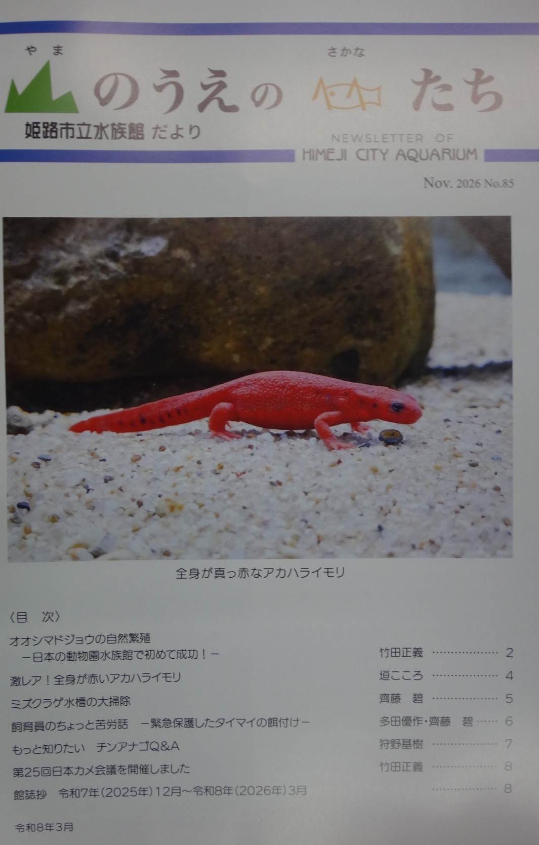 令和8年3月 山のうえの魚たち第85号を発刊しました。内容は「日本の動物園水族館で初めて成功したオオシマドジョウの自然繁殖」や「全身が赤いアカハライモリ」他について掲載しています。館内で無料配布中です。なお、新たなバックナンバーをダウンロードすることが可能になりました。こちらもよろしくお願いいたします。