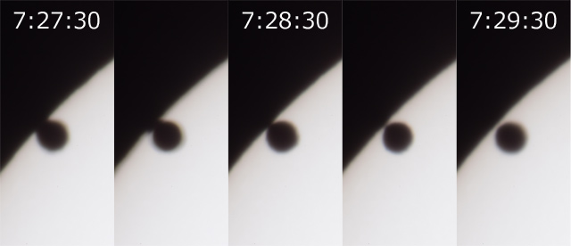 30分後ごとの金星を合成したものです。太陽の上をまっすぐに移動しているのがわかります。
