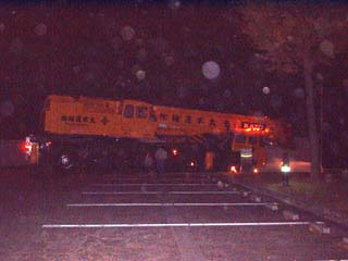 クレーンは全長20m、タイヤが16個もついている特大のものです。夜明けを待って作業開始です。 |