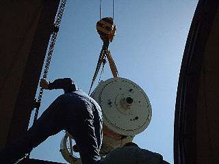 | ゆっくり吊り上げながら、ボルトをはずしていきます。上の人はバランスを調整しています。 |