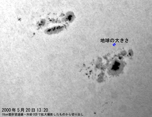 姫路科学館では2000年5月18日15時ごろ、10cm屈折望遠鏡に冷却CCDカメラをつけて黒点の様子を撮影しました。