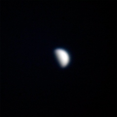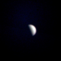 外合と内合の間では、日によって月の様に形が変わって見えます。でも、月とちがって地球と金星の間の距離が変わるので、写真を撮った外合から内合に向かう時期(宵の明星)は、細くなりながら大きく見えるようになります。