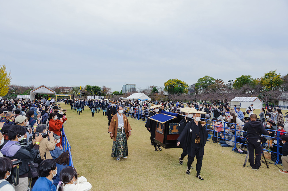 第71回姫路お城まつり(令和3年11月6日(土)開催)で大名行列再現パレードを始めて披露しました。 公募参加者を含む計88名にて編成された大名行列は、多くの来城者に見守られながら、武者溜りから大手門を抜け、三の丸広場特設ステージまで、約400mのコースを練り歩きました。