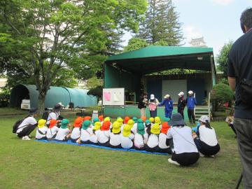 こども園、保育園の園児さんたちは、元気に、真剣にお話をきいていました。