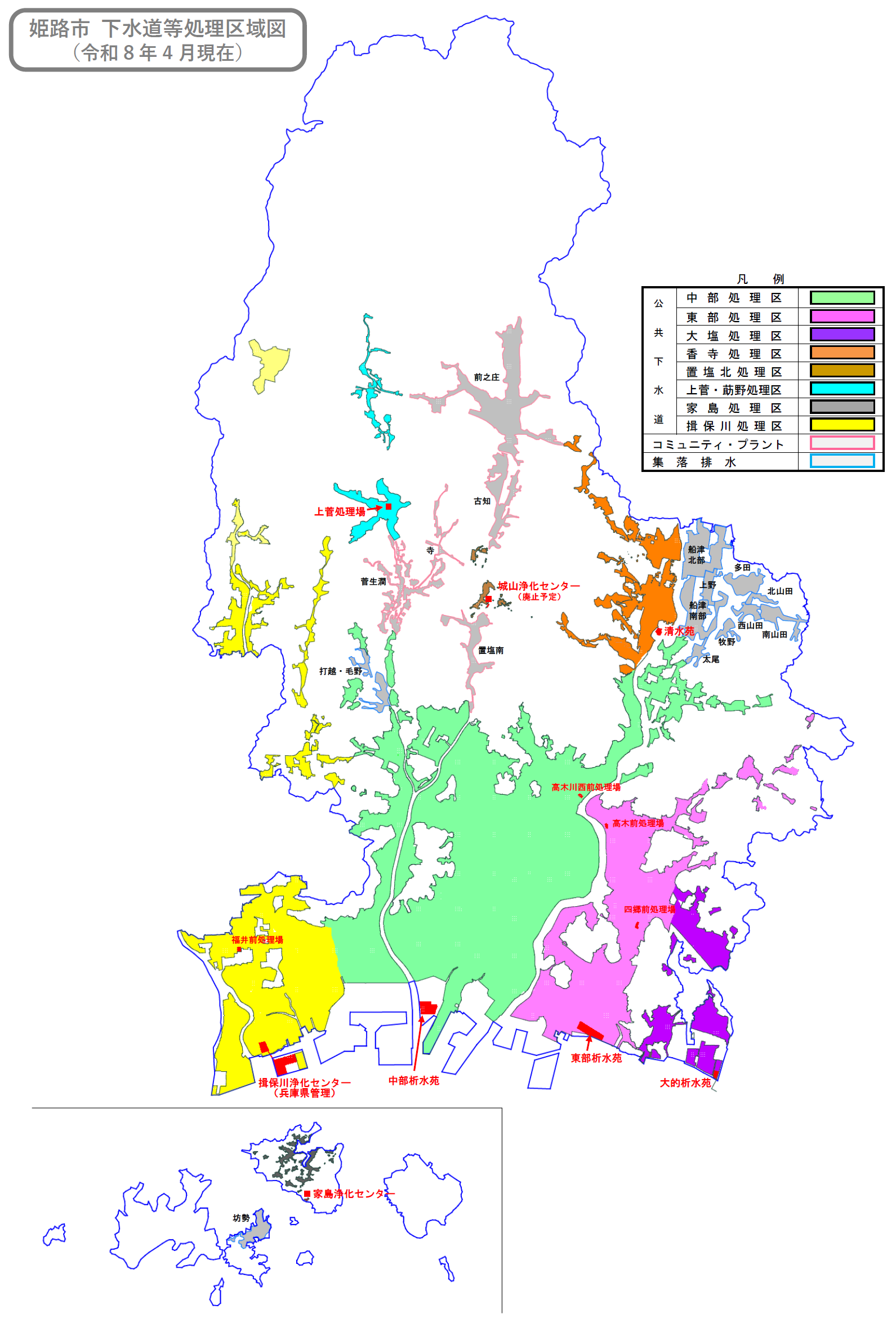 姫路市の下水道全体計画は、市域を7つの処理区に区分し、全処理区を合わせて約12,480ヘクタールを整備区域とし計画処理人口は約490,700人です。このうち、市西部の揖保川処理区は「流域関連公共下水道」で、兵庫県が管理する揖保川流域下水道(3市1町の広域処理)に接続しています。揖保川処理区以外は「単独公共下水道」として姫路市が管理する下水処理場で処理しています。