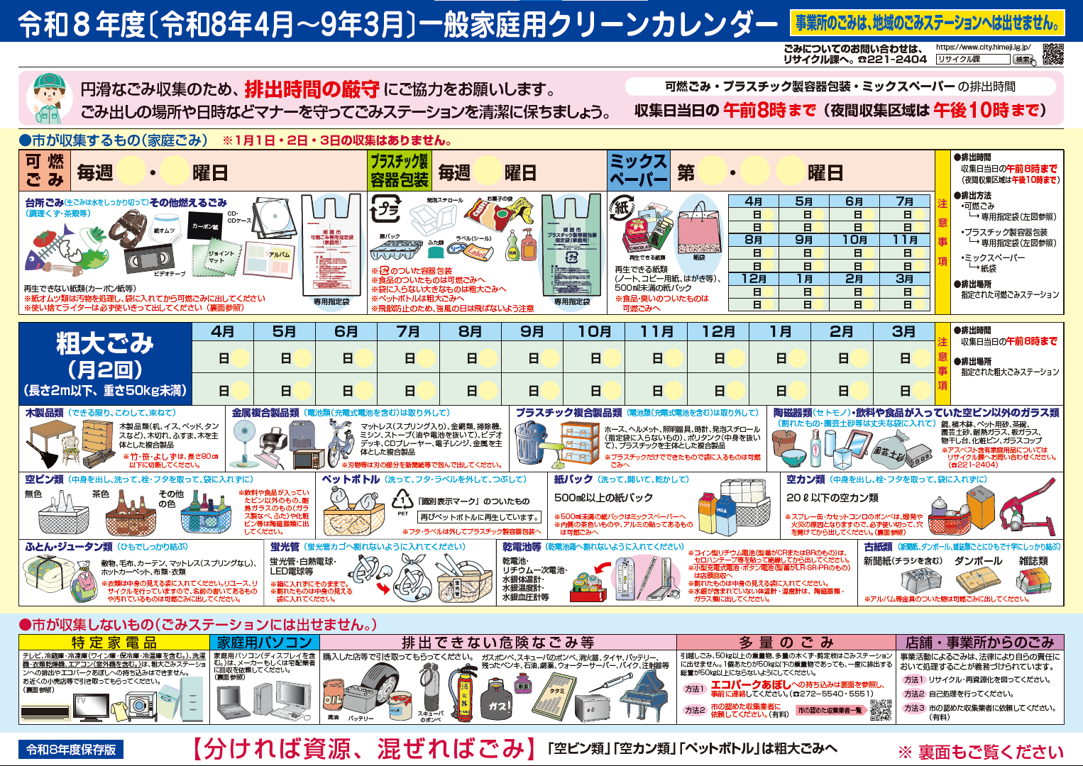 令和8年度広畑 (pdf、3.37MB)可燃ごみ 毎週月・木曜日、 プラスチック製容器包装 毎週水曜日、 ミックスペーパー 第2・4水曜日
