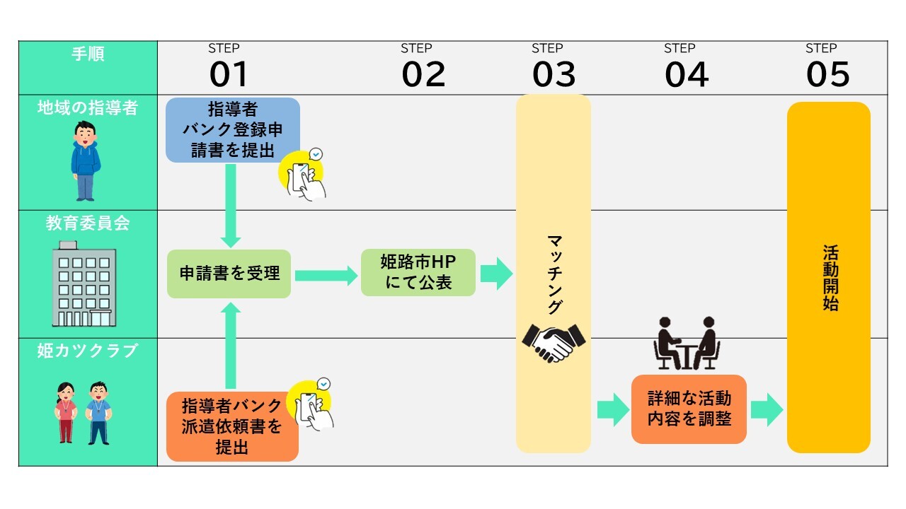 専門的な知識や経験、技能等を有している指導者と指導者を探している姫カツクラブをマッチングできる制度です。