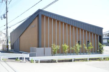 この剣道具店が立地する市川左岸は、工場や物流施設が集積する重要な生業の場であり、それに相応しい景観づくりが求められる。その中で、視認性の高い交差点に面して平屋を配置し、地域をリードする新たな景観づくりに取り組んでいる。交差点に勾配屋根の頂点を取ることで、アイストップとして強い印象を与え、その形状を強調するように、道路に面した壁面には開口をほとんど設けず、勾配屋根と連続する低明度の縦ハゼ外壁と木調パネル、縦格子、サインをうまく組み合わせている。西側道路から視認できる北側ファサードでは、整形で高さの抑えられた壁面に大きな開口部を確保し、店舗内部がうかがえる温かみのある風景を実現している。