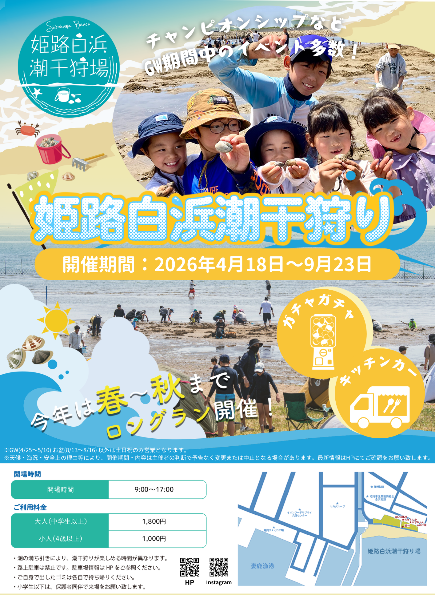 詳しくは、姫路白浜潮干狩場のホームページ別ウィンドウで開くをご覧ください。
