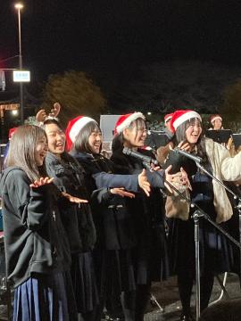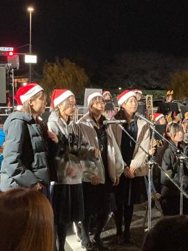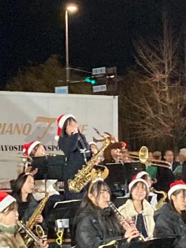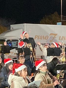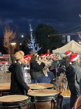 令和6年12月21日(土曜日)午後5時から大手前通り特設ステージにて、Himeji大手前通りイルミネーションにぎわいステージで演奏しました。待機中に通り雨に遭遇して、急いで軒下に避難したり打楽器にブルーシートをかけたり、屋外での演奏ならではの体験をしました。スタッフの方がブルーシートを用意してくださったり雨でぬれた椅子を拭いてくださったおかげで、無事に演奏することができました。寒い中でしたが、夜にお城をバックに演奏することは初めてで、イルミネーションが美しく感動しました。