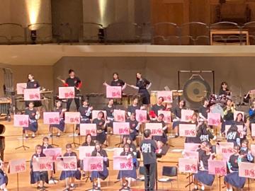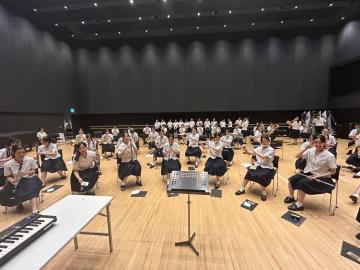令和6年4月6日土曜日の午後から、兵庫県吹奏楽連盟創立90周年記念演奏会のために、淳心学院と合同練習を本校の練習室で行いました。他校の生徒が本校の練習室に入るのは久しぶりのことで、90人弱の大合奏は迫力がありました。情熱大陸コレクションとフィンガーファイブコレクションを練習しました。振付の伝達が大変でしたが、熱心に淳心学院の部員さんは取り組んでいました。
