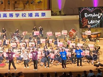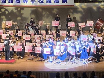 令和6年10月26日(土曜日)アクリエひめじ大ホールで、第48回兵庫県高等学校総合文化祭開会式行事に参加しました。淳心学院高等学校・姫路市立飾磨高等学校、兵庫県立香寺高等学校との合同演奏で総勢約150名からなる大編成でした。曲は八木澤教司作曲の「ファンファーレ:天と大地からの恵み」と「幸せを運ぶ翼ー兵庫五国の絆」を演奏しました。オープニングにふさわしい大人数での迫力のある演奏をすることができました。