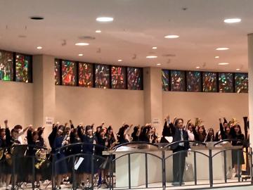 令和6年11月20日(水曜日)午後4時45分からパルナソスホールロビーにてクリスマスツリー点灯式がありました。ファンファーレ、Time to say Goodbye、We Wish You a Merry Christmas,フィンガーファイブコレクションを演奏しました。夕日に照らされたステンドグラスがとても美しく、クリスマスツリーも幻想的な青の照明でで大変良かったです。