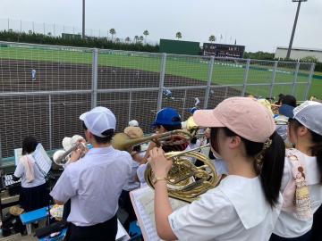 令和6年7月19日(金曜日)明石球場にて野球部の応援に行きました。野球部関係者と吹奏楽部だけでなく、一般の生徒もたくさん応援に来ていて、大応援団でエールを送りました。炎天下の中、精一杯の応援をしました。試合は残念ながら負けてしまいましたが、シード校の須磨翔風高校相手に健闘しました。この試合だけでなく、ここまで勝ち進み、我々に勇気を与えてくれた野球部の皆さんに感謝します。