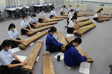 8月5日 土曜日にパルナソスホールで行われる邦楽発表会に向けて、筝曲部が最後の仕上げ練習に励んでいます。プロジェクトルームでは今日も真剣な表情で7年生1人、8年生10人、9年生6人が爪で弦を弾いていました。邦楽発表会では17人の部員が「波の戯れ(なみのたわむれ)」という曲を演奏する予定です。