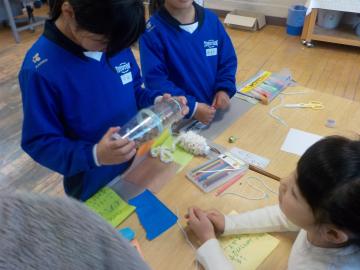 教科書に載っているおもちゃだけでなく、自分たちでオリジナルのおもちゃを作り、お店屋さんにも挑戦しました。1組、2組がお互いに招待し合ってお店屋さんを楽しみました。