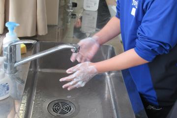 家庭科室で4年生が防災学習としてポリぶくろを使った調理に取り組みました。今回取り組んだのはごはんを炊いておにぎりを作ることです。耐熱性のポリぶくろに無洗米と水を入れ、袋ごと沸騰したお湯の中で煮た後、蒸らします。袋ごと取り出した後、手袋をつけた手で握ったおにぎりをさっそくいただきました。調理器具も手もほとんど汚さない簡単調理ですが、甘いお米の味が感じられるおいしいおにぎりができあがりました。