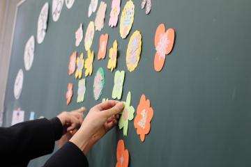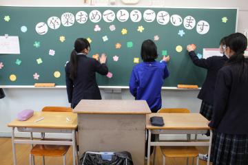 卒業式前日、明日は式場となる体育館への直接登校となる9年生は今日が最後の教室への入室となりました。1年間当たり前に入室していた教室に入ると、前日放課後、美術部員が飾り付けてくれた黒板がありました。