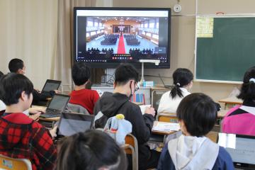 晴天の下、義務教育学校豊富小中学校の4回目の卒業証書授与式が行われ83名の卒業生が巣立ちました。新型コロナウイルスの五類引き下げによる初めての卒業式となり、今年度は保護者に加え8年生が卒業式に参列しました。7年生はミートにより各教室で卒業式の様子を見ました。