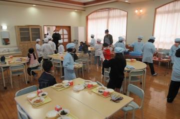 (前期課程)ランチルームで兄弟学級の2つのクラスが配膳を行っています