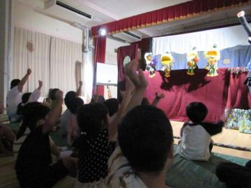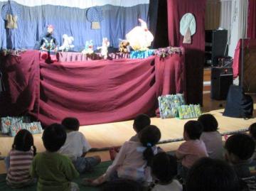 地域の公民館の事業で、人形劇を観劇しました。人形と一緒に歌を歌ったり、お話を見たりして楽しい時間を過ごしました。