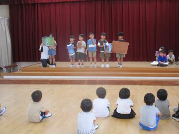 5歳児が伊勢自然の里に行って、いろいろな自然を経験しました。珍しい生き物を見付けたり、たくさん話を聞いたりしたことを、お家の方や3,4歳児に報告しました。