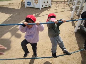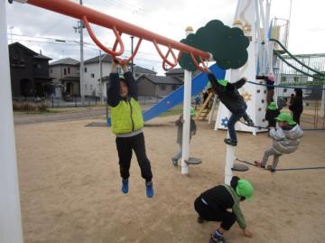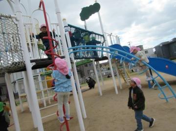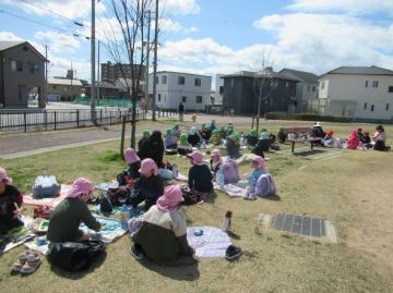 年長児が、年少児と年中児と手を繋いで、苫編バイパス南公園まで遠足に行きました。たくさんの遊具で遊んだり、一年間いっしょに過ごした友達や先生と、鬼ごっこやロンドン橋落ちるを楽しんだり、みんなで春の自然の中で、お弁当を食べました。帰り道では、「楽しかったね」「また、遊びたいね」と、友達同士で話が弾んでいました。