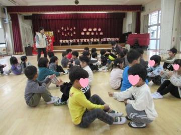 園に飾っている雛段飾りを見て、「かわいいな」「ほしいな」と、声が上がりました。そこで、3歳児、4歳児、5歳児それぞれの発達段階に応じて雛人形を製作し、遊戯室に飾りました。3月3日は、自分で製作したお雛様を見ながら、ひな祭りの集いを楽しみました。雛壇の話を聞いたり、歌を歌ったり、触れ合い遊びをしたりして楽しく過ごしました。