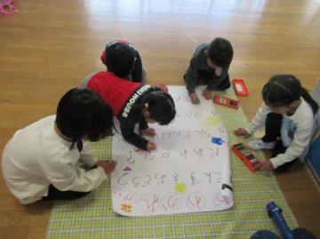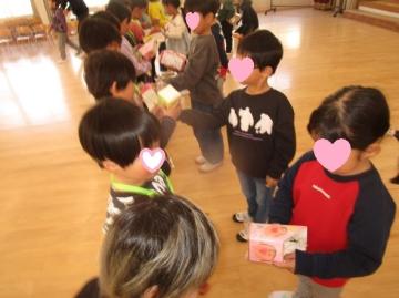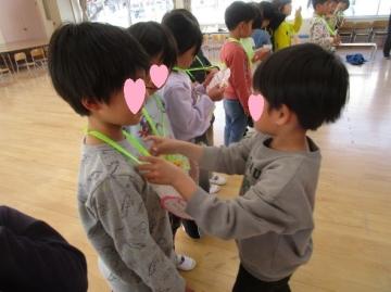 遠足のとき、手を繋いで歩いてもらった年長組さん。鬼ごっこやドッチボールなど、一緒に遊んでもらった年長組さん。困ったとき、やさしく声を掛けてもらった年長組さん。「ありがとう、小学校も頑張ってね」の気持ちを伝えるために、4歳児がお別れ会を企画しました。ダンスやゲーム、当てっこクイズ、歌や言葉のプレゼント、そして最後には3歳児・4歳児が心を込めてつくった手作りのメダルや鉛筆立てをプレゼントしました。「どうもありがとう」「大事にするよ」と5歳児が喜んでくれました。