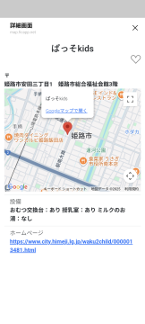 施設詳細画面では、おむつ交換台や授乳室の有無、ミルク用のお湯が提供されているかといった具体的な設備情報を確認することが可能です。