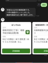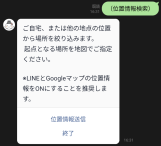 利用者は、LINEのメニュー画面から現在地を送信し、検索範囲を選択することで、近くにある施設を検索できます。